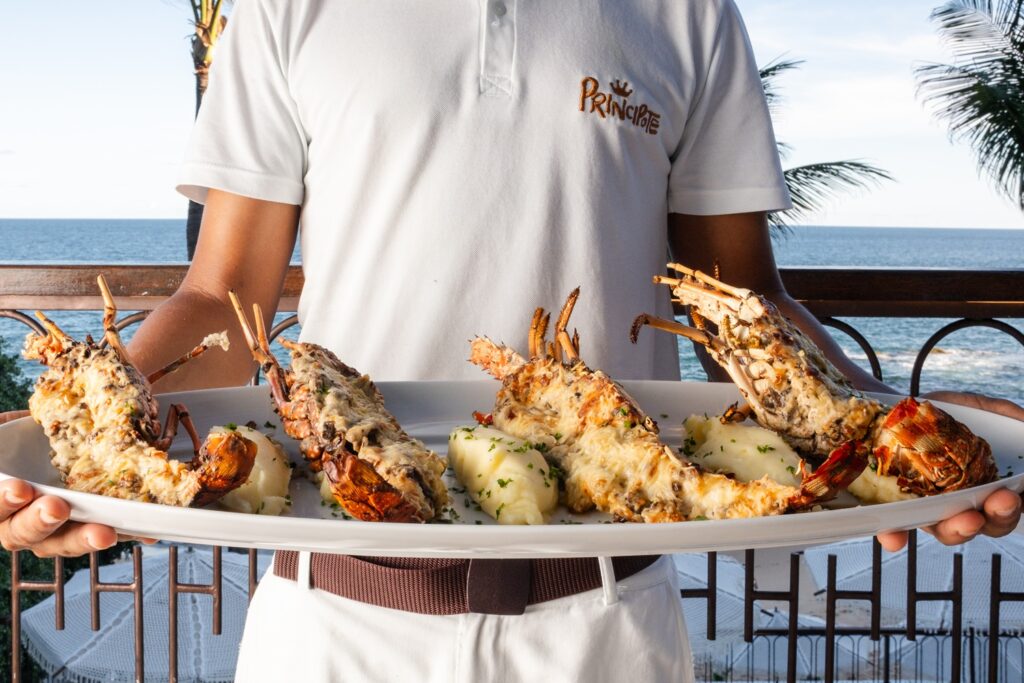 Nos principais, o Spaghetti al Mare sintetiza a proposta mediterrânea ao reunir massa envolta em molho pomodoro com bisque cremosa, acompanhado de lagosta, camarão, polvo, lula e mexilhões, finalizada com manjericão fresco. Já a Grigliata Principote traz uma seleção de frutos do mar grelhados, como lagosta, peixe, lula, polvo e mexilhões, servidos com batatinhas ao murro, legumes e arroz de moqueca. A Lagosta Thermidor , por sua vez, aposta na tradição e o francesa, gratinada com molho bechamel, cogumelos e parmesão. O Peixe Espalmado , grelhado e finalizado com ervas e limão, reforça a leveza do cardápio, servido com farofa de banana-da-terra e arroz de moqueca, com toque baiano.